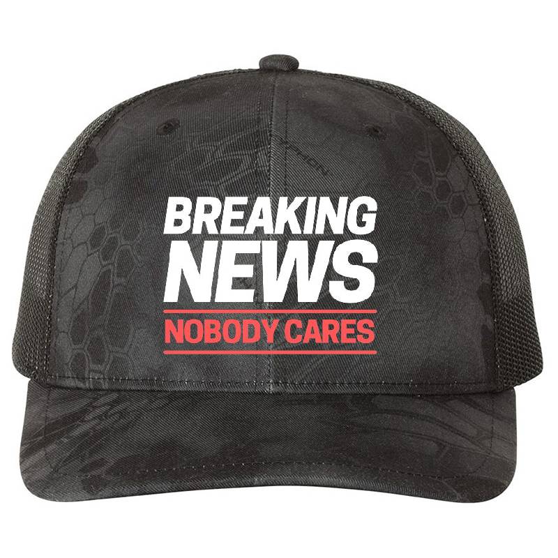 Breaking News Nobody Cares design artwork printed on Richardson Premium Trucker Snapback Cap with latest DTF technology. Our new management team will place serving you. We offer best online shopping experience to our customers with 30 days return and exchange policy. Shop with confidence at T-funny.comProduct Details
