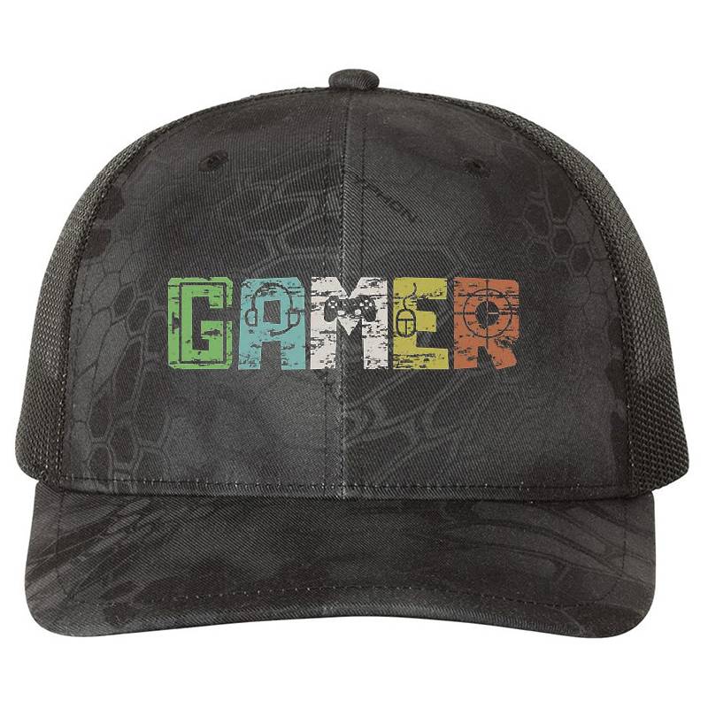 Gamer lettering vintage PC console controller gamer gaming design artwork printed on Richardson Premium Trucker Snapback Cap with latest DTF technology. Our new management team will place serving you. We offer best online shopping experience to our customers with 30 days return and exchange policy. Shop with confidence at T-funny.comProduct Details