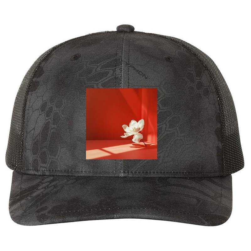 Single white flower in a red room minimalist print design artwork printed on Richardson Premium Trucker Snapback Cap with latest DTF technology. Our new management team will place serving you. We offer best online shopping experience to our customers with 30 days return and exchange policy. Shop with confidence at T-funny.comProduct Details