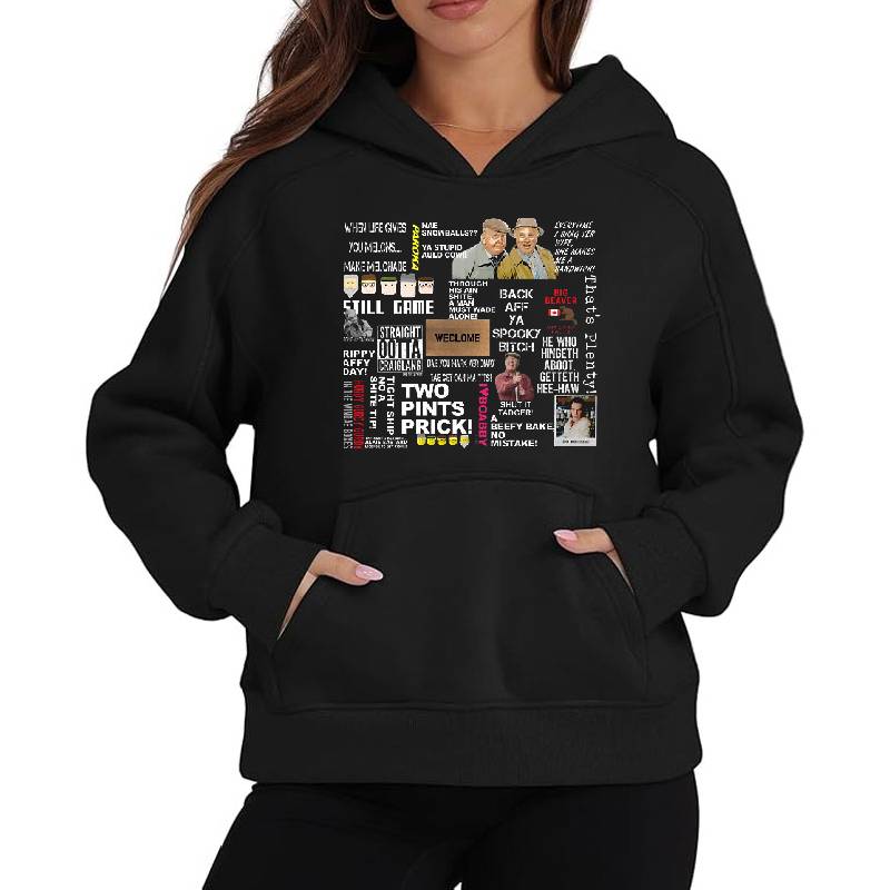 Still Game Scrap Book design artwork printed on Unisex Hooded Sweatshirt with latest DTF technology. Our new management team will place serving you. We offer best online shopping experience to our customers with 30 days return and exchange policy. Shop with confidence at T-funny.com