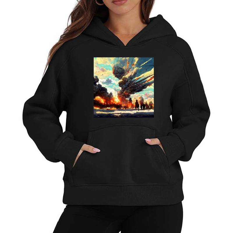 Epic explosion smoke plume during war design artwork printed on Unisex Hooded Sweatshirt with latest DTF technology. Our new management team will place serving you. We offer best online shopping experience to our customers with 30 days return and exchange policy. Shop with confidence at T-funny.com
