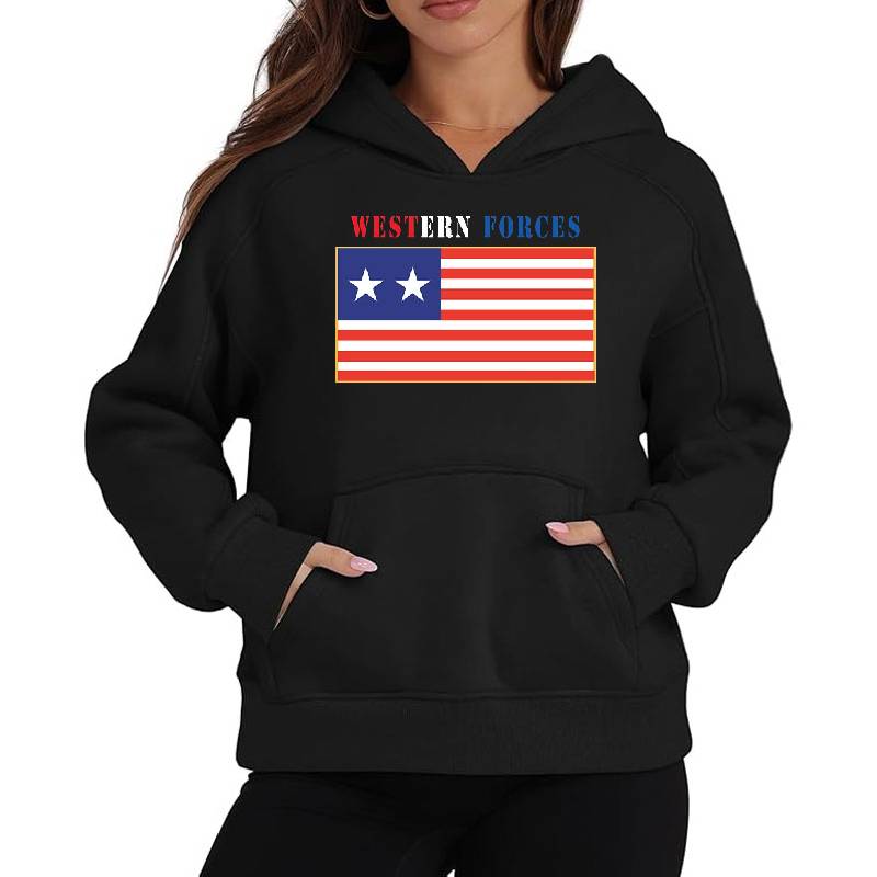 Flag - Western Forces - 2 Star Flag w Txt X 300 design artwork printed on Unisex Hooded Sweatshirt with latest DTF technology. Our new management team will place serving you. We offer best online shopping experience to our customers with 30 days return and exchange policy. Shop with confidence at T-funny.com