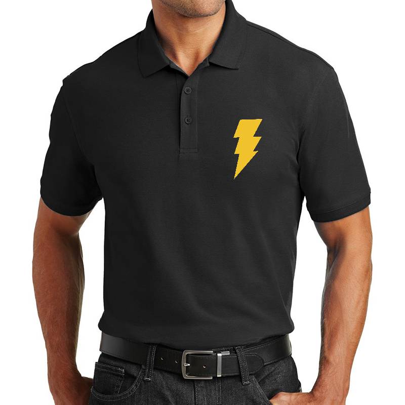 Shazam Logo - DC Comics design artwork printed on Unisex Polo Jersey Sport Shirt with latest DTF technology. Our new management team will place serving you. We offer best online shopping experience to our customers with 30 days return and exchange policy. Shop with confidence at T-funny.com