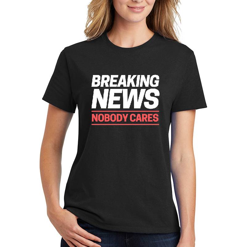 Breaking News Nobody Cares design artwork printed on Unisex T-Shirt with latest DTF technology. Our new management team will place serving you. We offer best online shopping experience to our customers with 30 days return and exchange policy. Shop with confidence at T-funny.com