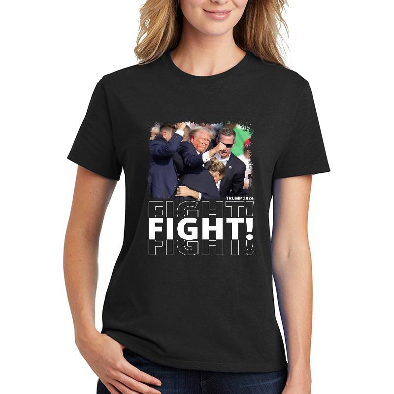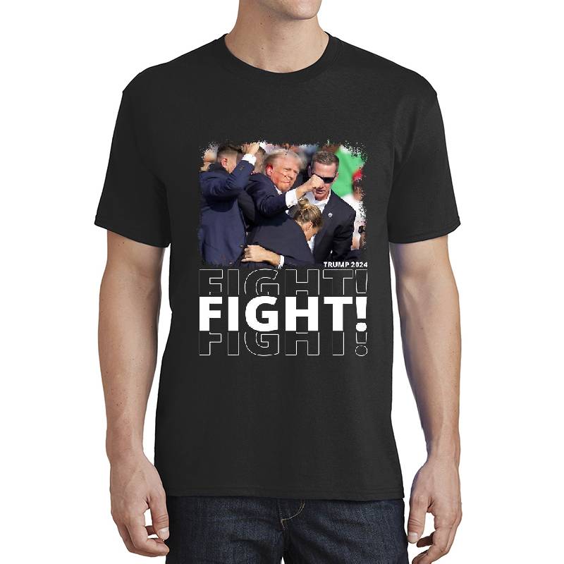 Trump Fight Fight Fight design artwork printed on Unisex T-Shirt with latest DTF technology. Our new management team will place serving you. We offer best online shopping experience to our customers with 30 days return and exchange policy. Shop with confidence at T-funny.com