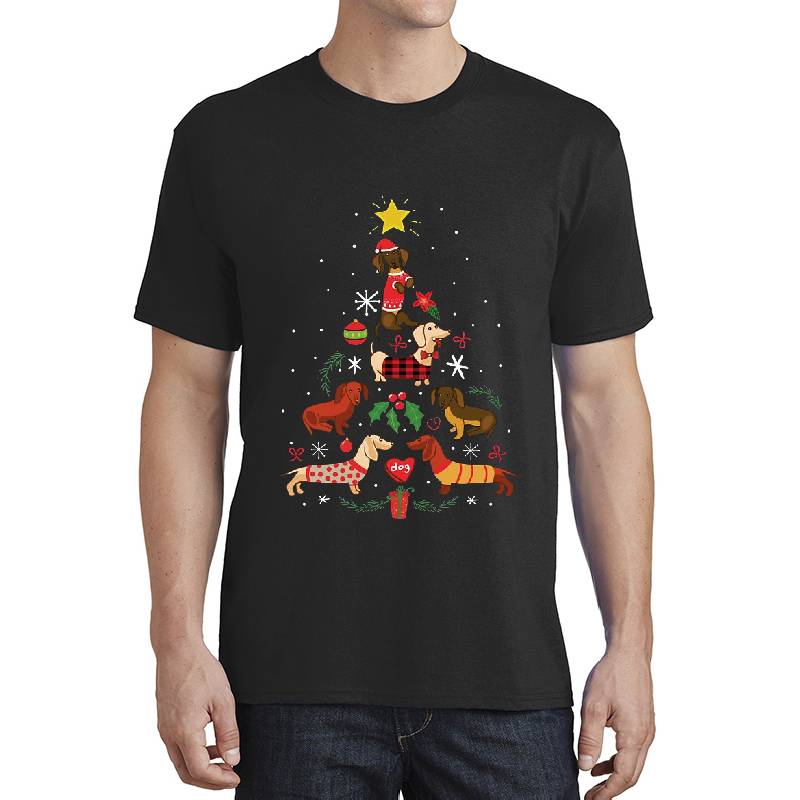 Funny Dachshund Christmas Tree Shirt Ornament Decor Gift design artwork printed on Unisex T-Shirt with latest DTF technology. Our new management team will place serving you. We offer best online shopping experience to our customers with 30 days return and exchange policy. Shop with confidence at T-funny.com