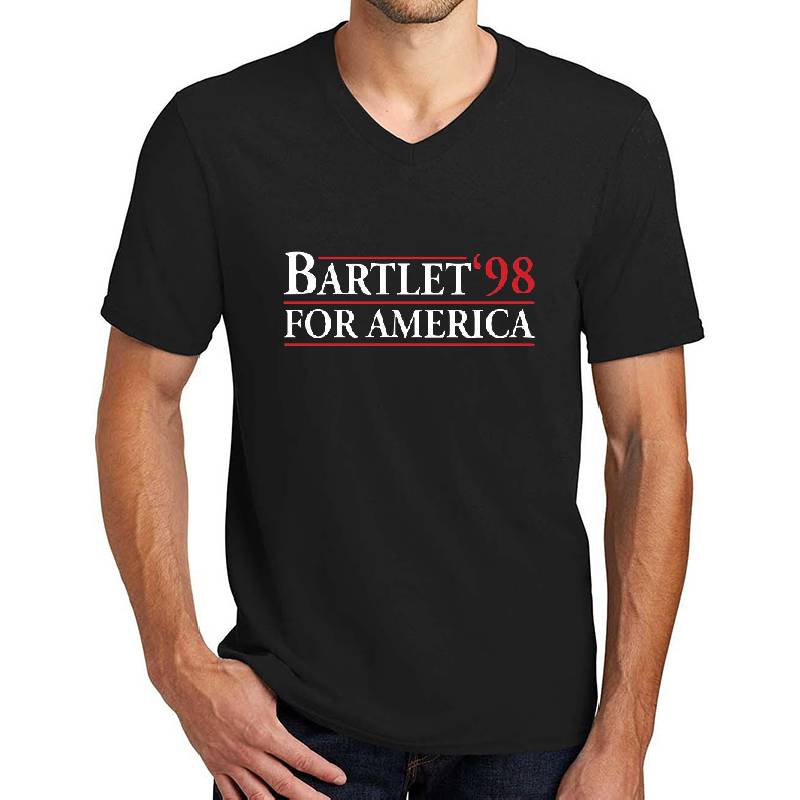 Bartlet for America (white variant) design artwork printed on Unisex V-Neck T-Shirt with latest DTF technology. Our new management team will place serving you. We offer best online shopping experience to our customers with 30 days return and exchange policy. Shop with confidence at T-funny.comProduct Details