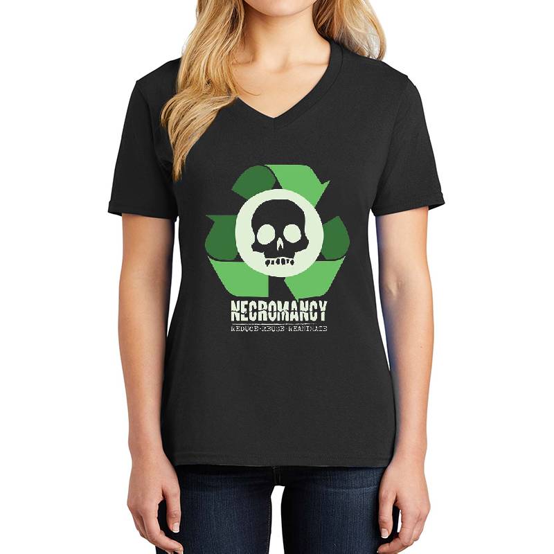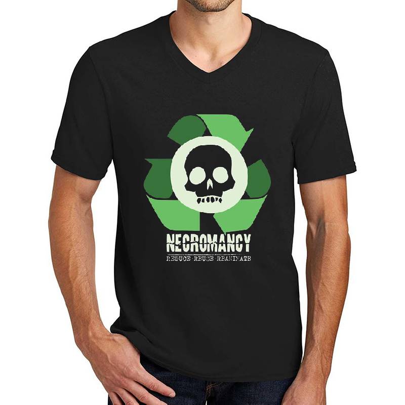 Necromancy: Reduce, Reuse, Reanimate design artwork printed on Unisex V-Neck T-Shirt with latest DTF technology. Our new management team will place serving you. We offer best online shopping experience to our customers with 30 days return and exchange policy. Shop with confidence at T-funny.comProduct Details