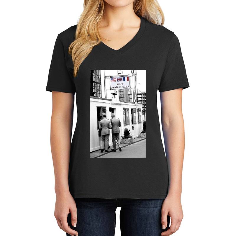 Cold War Berlin, Checkpoint Charlie design artwork printed on Unisex V-Neck T-Shirt with latest DTF technology. Our new management team will place serving you. We offer best online shopping experience to our customers with 30 days return and exchange policy. Shop with confidence at T-funny.comProduct Details