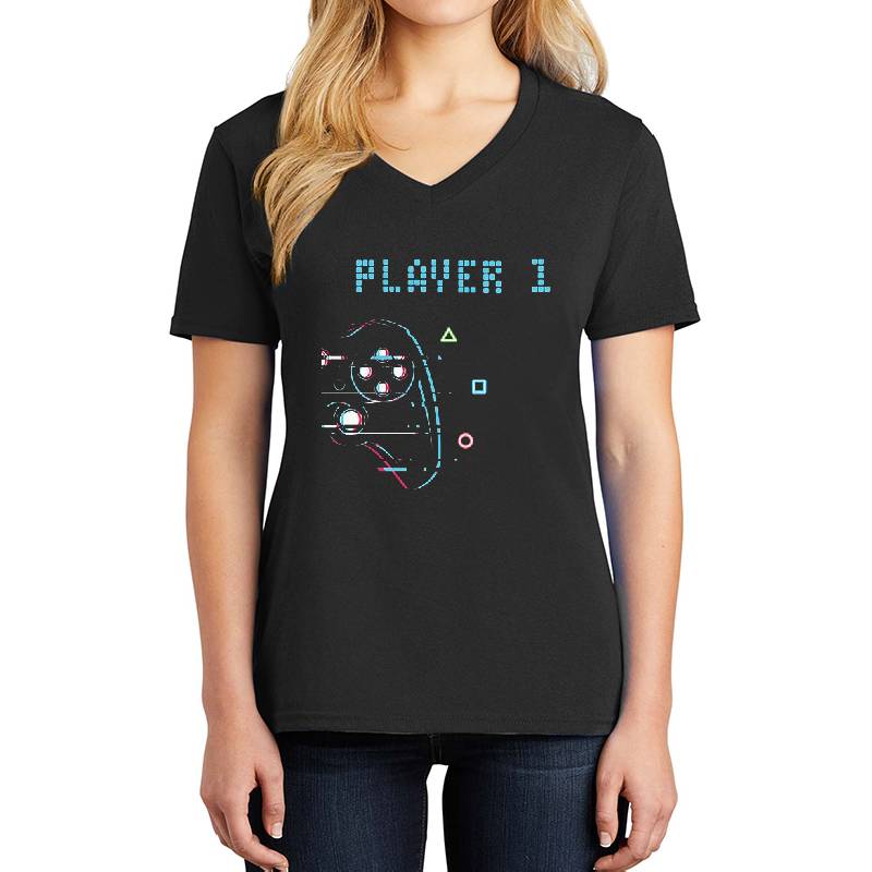 Matching Gamer Couple Tees Player 1 and Player 2 Lovers Unisex V-Neck T-Shirts