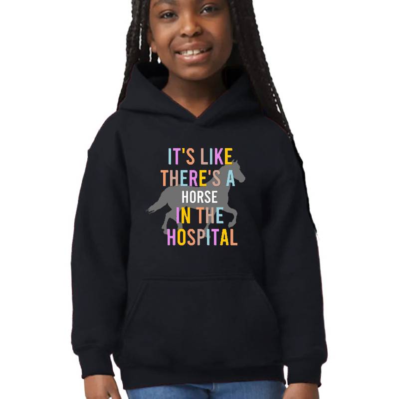 Horse In The Hospital design artwork printed on Youth Hooded Sweatshirt with latest DTF technology. Our new management team will place serving you. We offer best online shopping experience to our customers with 30 days return and exchange policy. Shop with confidence at T-funny.com