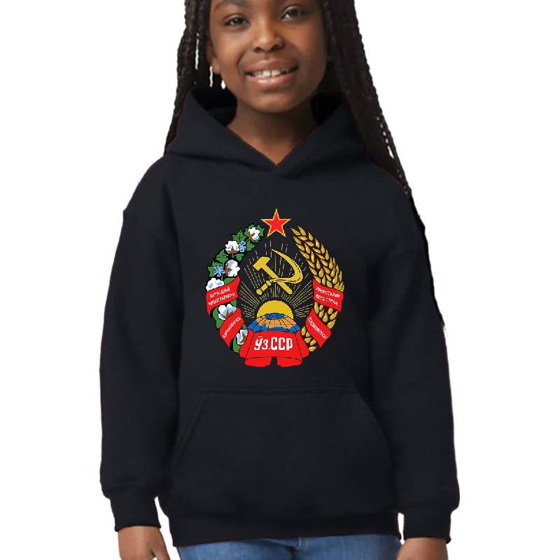 Socialist Uzbekistan Emblem design artwork printed on Youth Hooded Sweatshirt with latest DTF technology. Our new management team will place serving you. We offer best online shopping experience to our customers with 30 days return and exchange policy. Shop with confidence at T-funny.com