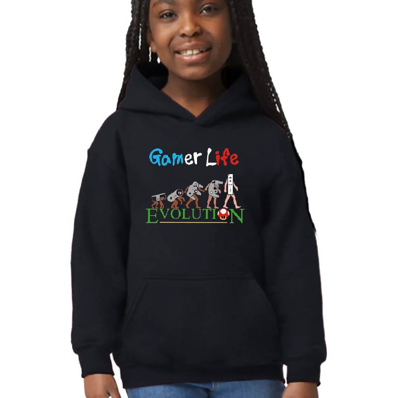 Gamer evolution design artwork printed on Youth Hooded Sweatshirt with latest DTF technology. Our new management team will place serving you. We offer best online shopping experience to our customers with 30 days return and exchange policy. Shop with confidence at T-funny.com