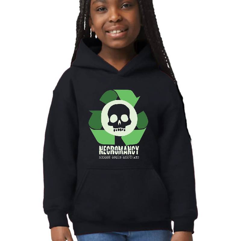 Necromancy: Reduce, Reuse, Reanimate design artwork printed on Youth Hooded Sweatshirt with latest DTF technology. Our new management team will place serving you. We offer best online shopping experience to our customers with 30 days return and exchange policy. Shop with confidence at T-funny.com