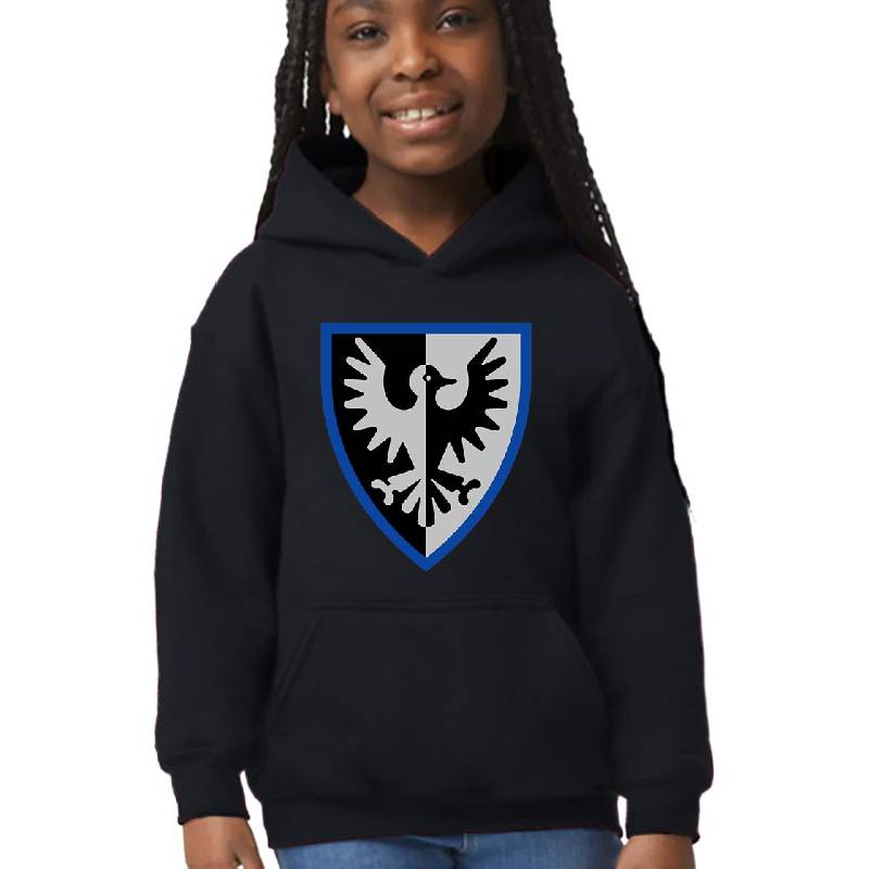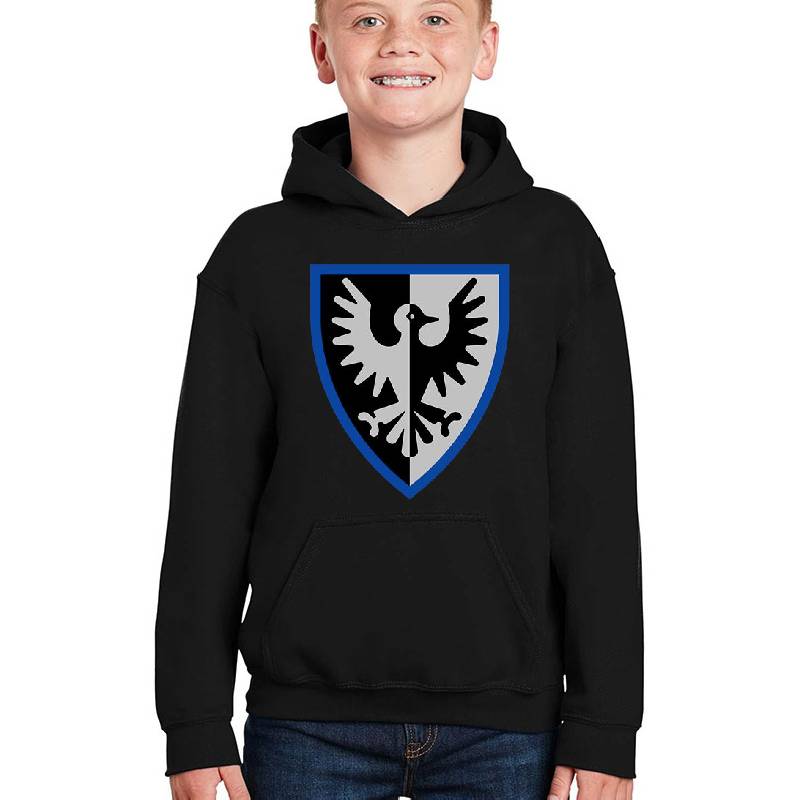 Black Falcon Shield Emblem - Blue design artwork printed on Youth Hooded Sweatshirt with latest DTF technology. Our new management team will place serving you. We offer best online shopping experience to our customers with 30 days return and exchange policy. Shop with confidence at T-funny.com