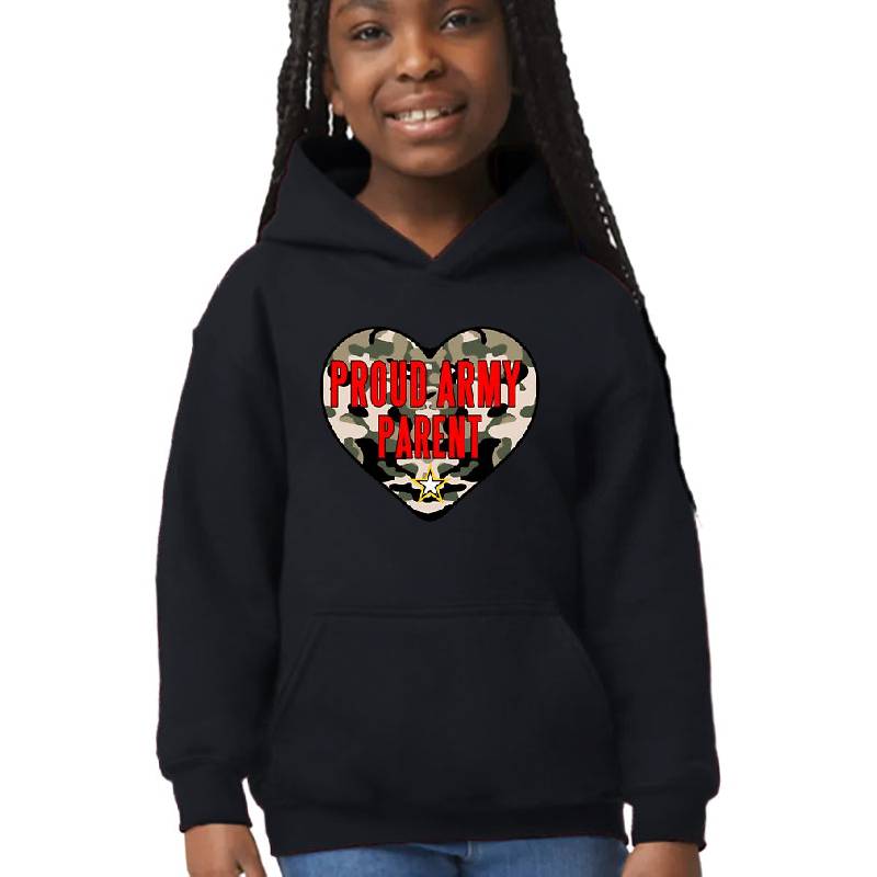 PROUD ARMY PARENT design artwork printed on Youth Hooded Sweatshirt with latest DTF technology. Our new management team will place serving you. We offer best online shopping experience to our customers with 30 days return and exchange policy. Shop with confidence at T-funny.com