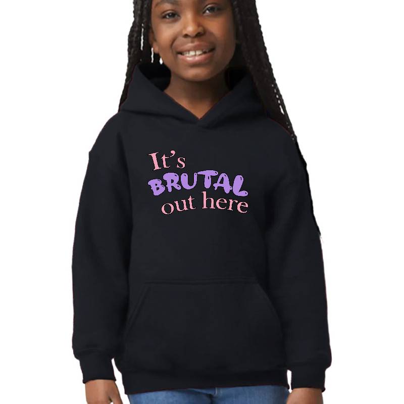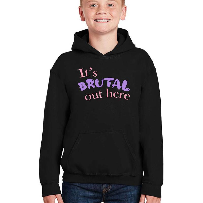 It's Brutal Out Here design artwork printed on Youth Hooded Sweatshirt with latest DTF technology. Our new management team will place serving you. We offer best online shopping experience to our customers with 30 days return and exchange policy. Shop with confidence at T-funny.com