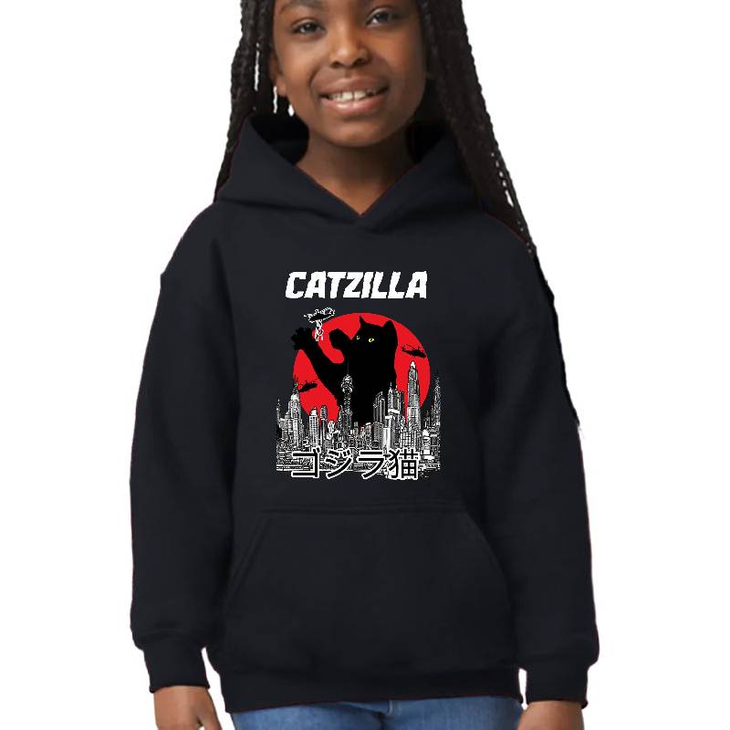 Catzilla design artwork printed on Youth Hooded Sweatshirt with latest DTF technology. Our new management team will place serving you. We offer best online shopping experience to our customers with 30 days return and exchange policy. Shop with confidence at T-funny.com