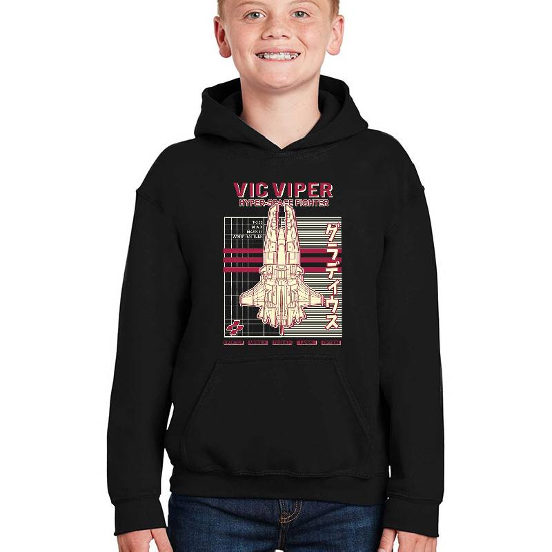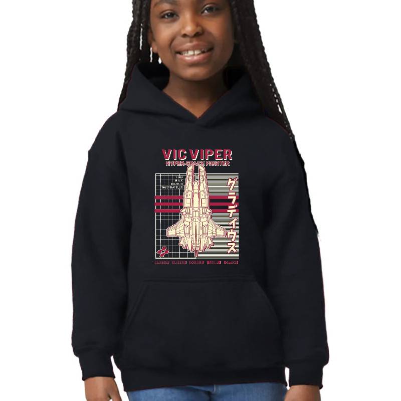 Hyper Space Fighter Vic Viper design artwork printed on Youth Hooded Sweatshirt with latest DTF technology. Our new management team will place serving you. We offer best online shopping experience to our customers with 30 days return and exchange policy. Shop with confidence at T-funny.com