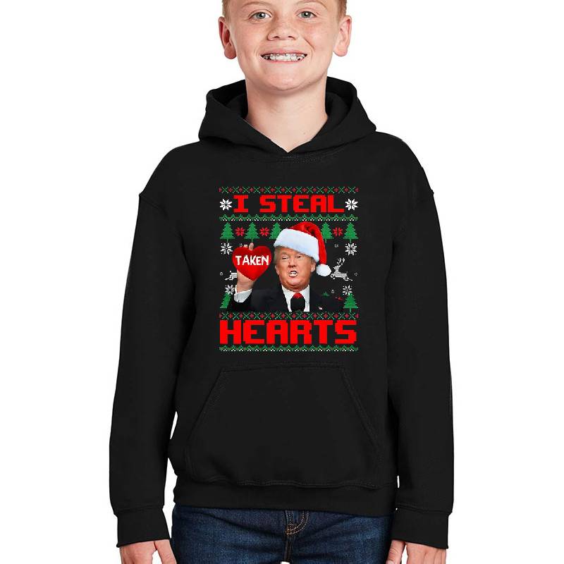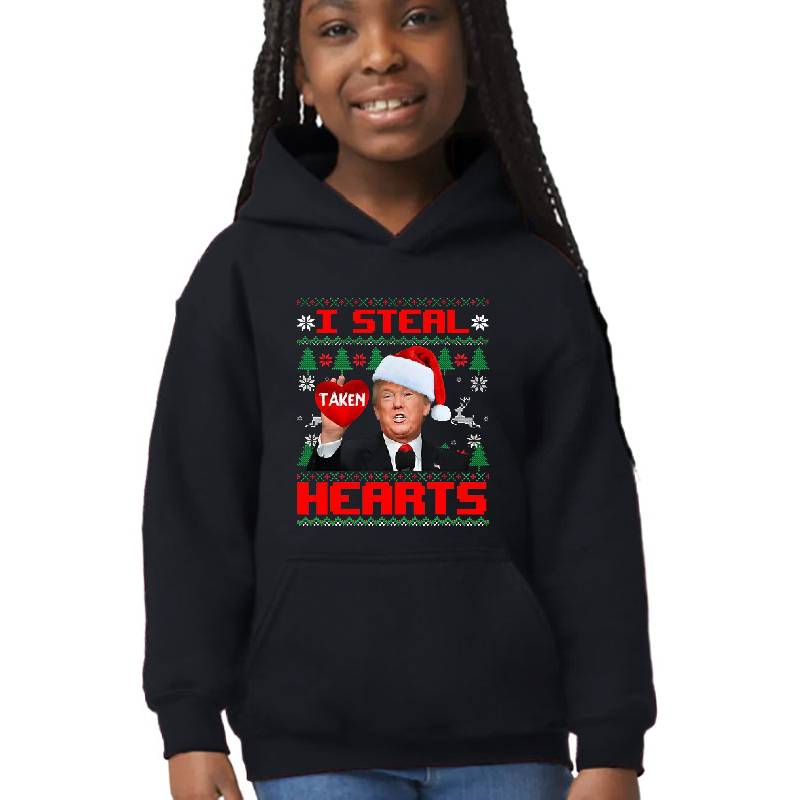 Santa Trump I Steal Hearts Valentines design artwork printed on Youth Hooded Sweatshirt with latest DTF technology. Our new management team will place serving you. We offer best online shopping experience to our customers with 30 days return and exchange policy. Shop with confidence at T-funny.com