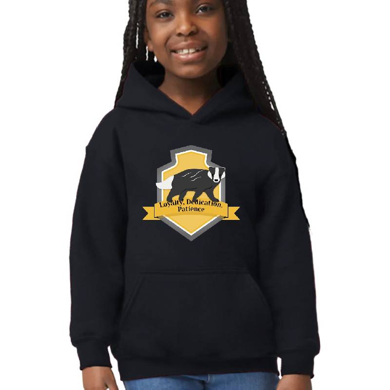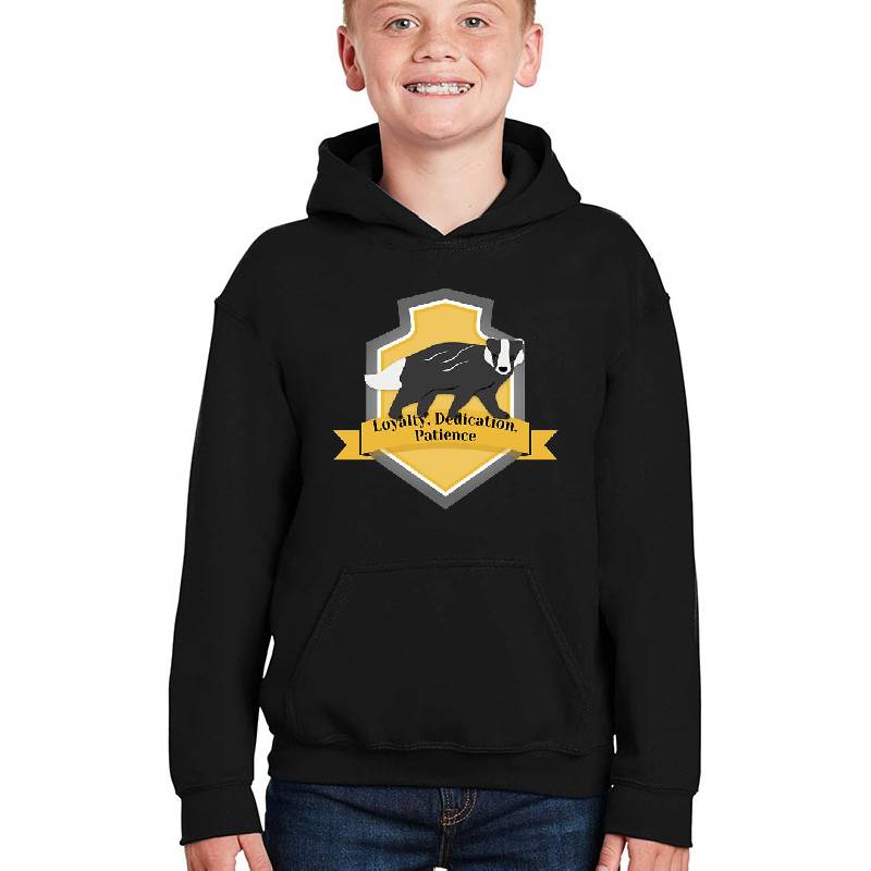 Loyalty, Dedication, Patience Potterhead Emblem design artwork printed on Youth Hooded Sweatshirt with latest DTF technology. Our new management team will place serving you. We offer best online shopping experience to our customers with 30 days return and exchange policy. Shop with confidence at T-funny.com