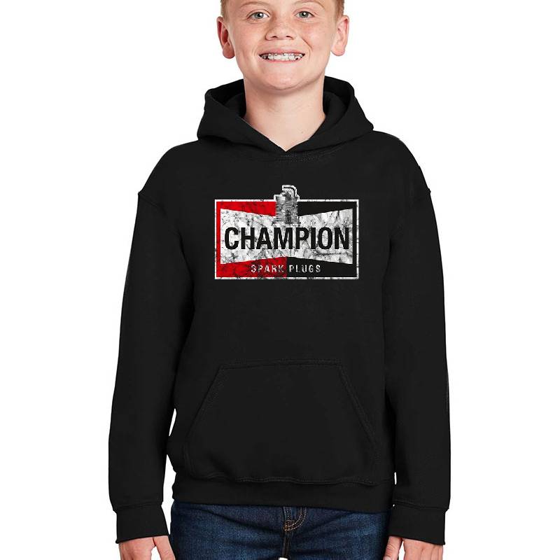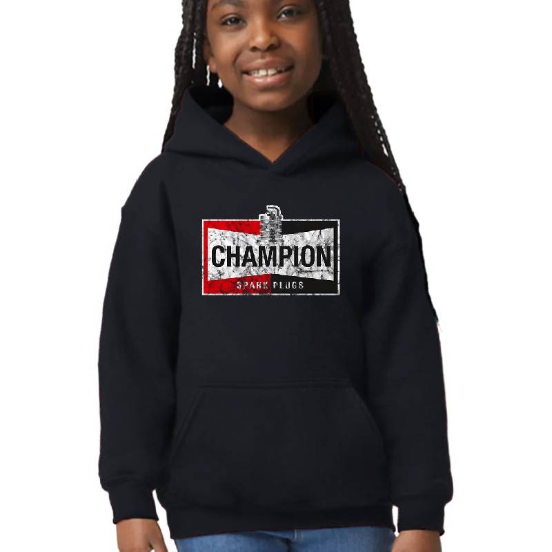 Champion Spark Plugs Distressed Logo design artwork printed on Youth Hooded Sweatshirt with latest DTF technology. Our new management team will place serving you. We offer best online shopping experience to our customers with 30 days return and exchange policy. Shop with confidence at T-funny.com