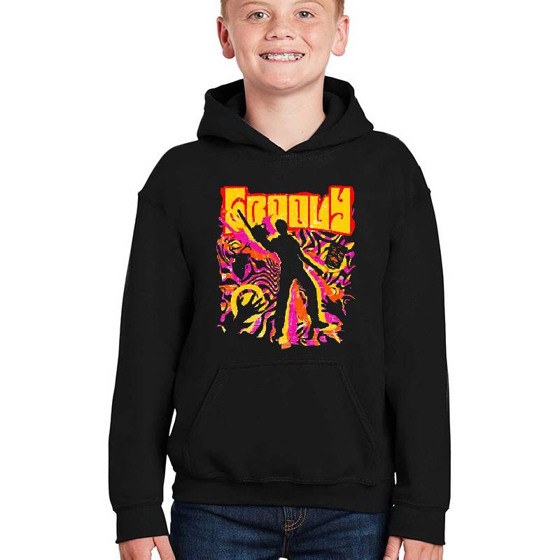 Stay Groovy - Evil Dead design artwork printed on Youth Hooded Sweatshirt with latest DTF technology. Our new management team will place serving you. We offer best online shopping experience to our customers with 30 days return and exchange policy. Shop with confidence at T-funny.com