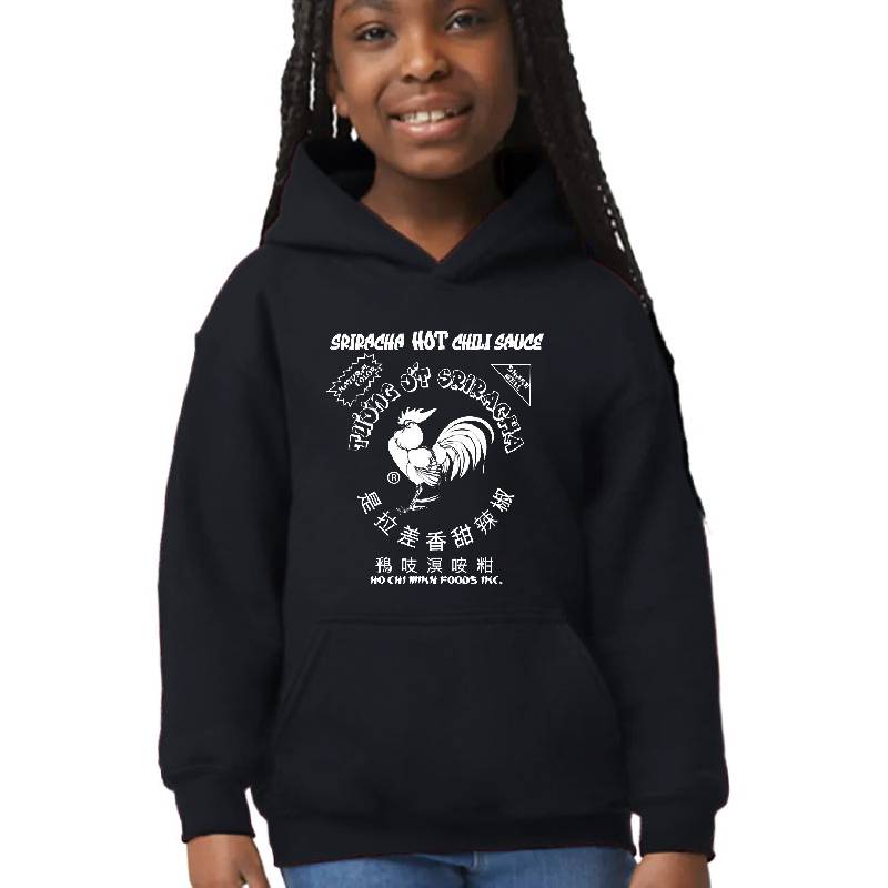 Sriracha spicy rooster hot chili sauce design artwork printed on Youth Hooded Sweatshirt with latest DTF technology. Our new management team will place serving you. We offer best online shopping experience to our customers with 30 days return and exchange policy. Shop with confidence at T-funny.com