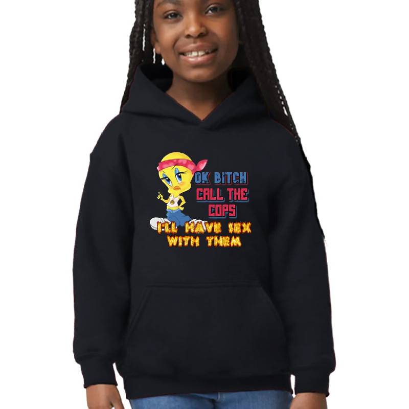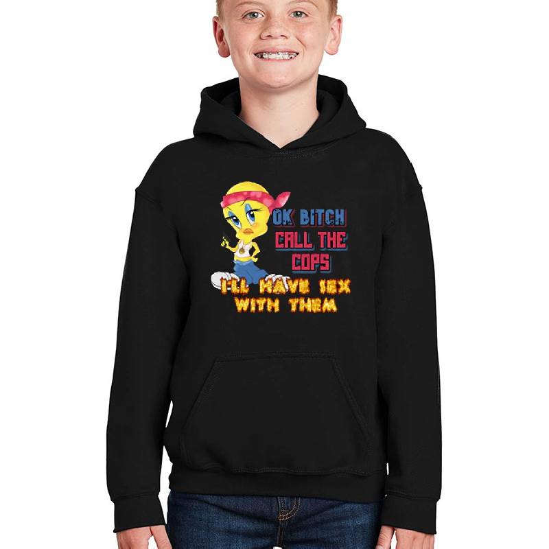 Ok Bitch Call The Cops I’ll Have Sex With Them design artwork printed on Youth Hooded Sweatshirt with latest DTF technology. Our new management team will place serving you. We offer best online shopping experience to our customers with 30 days return and exchange policy. Shop with confidence at T-funny.com
