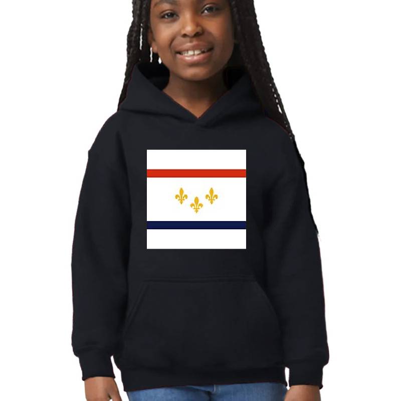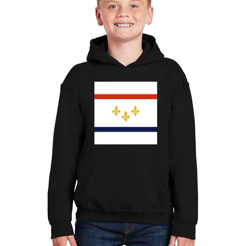New Orleans Flag design artwork printed on Youth Hooded Sweatshirt with latest DTF technology. Our new management team will place serving you. We offer best online shopping experience to our customers with 30 days return and exchange policy. Shop with confidence at T-funny.com