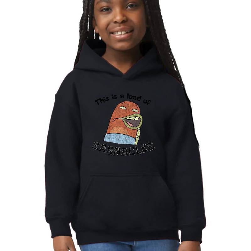 SpongeBob SquarePants This Is A Load Of Barnacles design artwork printed on Youth Hooded Sweatshirt with latest DTF technology. Our new management team will place serving you. We offer best online shopping experience to our customers with 30 days return and exchange policy. Shop with confidence at T-funny.com