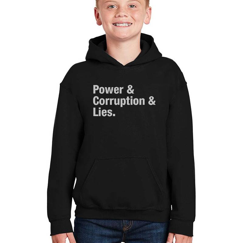 Power Corruption Lies, silver design artwork printed on Youth Hooded Sweatshirt with latest DTF technology. Our new management team will place serving you. We offer best online shopping experience to our customers with 30 days return and exchange policy. Shop with confidence at T-funny.com