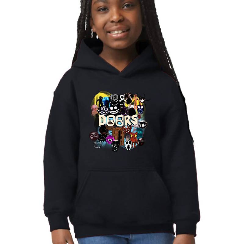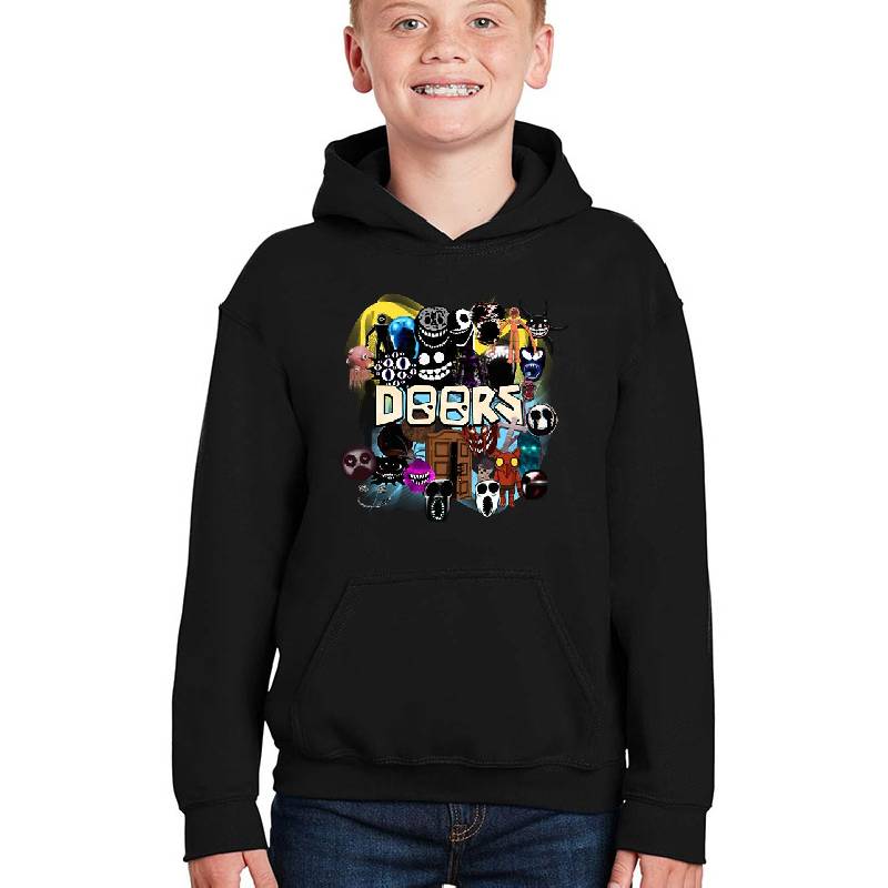 Doors All the Entities New Doors Game Update design artwork printed on Youth Hooded Sweatshirt with latest DTF technology. Our new management team will place serving you. We offer best online shopping experience to our customers with 30 days return and exchange policy. Shop with confidence at T-funny.com