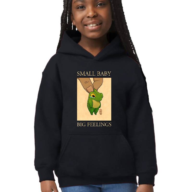 small baby big feelings cute frog artwork asian japanese chinese style drawing transparent bg design artwork printed on Youth Hooded Sweatshirt with latest DTF technology. Our new management team will place serving you. We offer best online shopping experience to our customers with 30 days return and exchange policy. Shop with confidence at T-funny.com