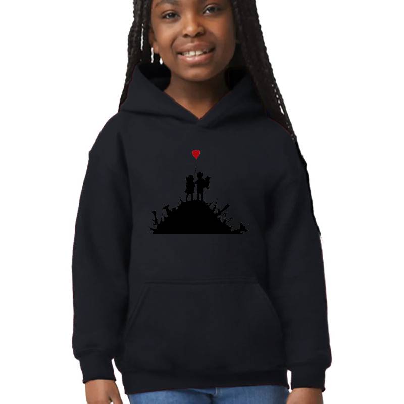 Banksy girl and boy with balloon heart design artwork printed on Youth Hooded Sweatshirt with latest DTF technology. Our new management team will place serving you. We offer best online shopping experience to our customers with 30 days return and exchange policy. Shop with confidence at T-funny.com