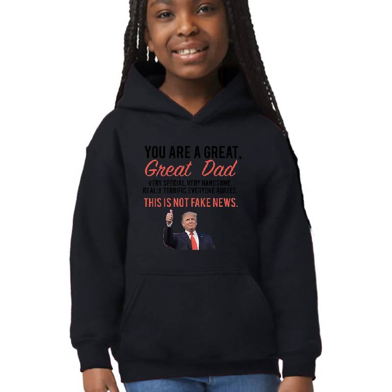 Dad Holiday Gift Fathers day donald trump design artwork printed on Youth Hooded Sweatshirt with latest DTF technology. Our new management team will place serving you. We offer best online shopping experience to our customers with 30 days return and exchange policy. Shop with confidence at T-funny.com