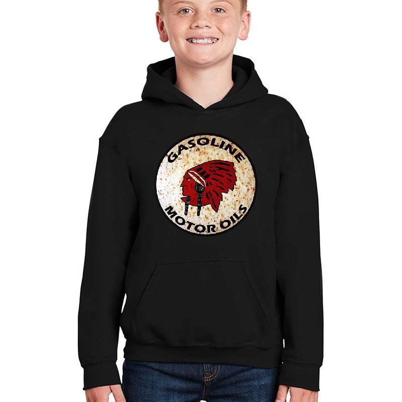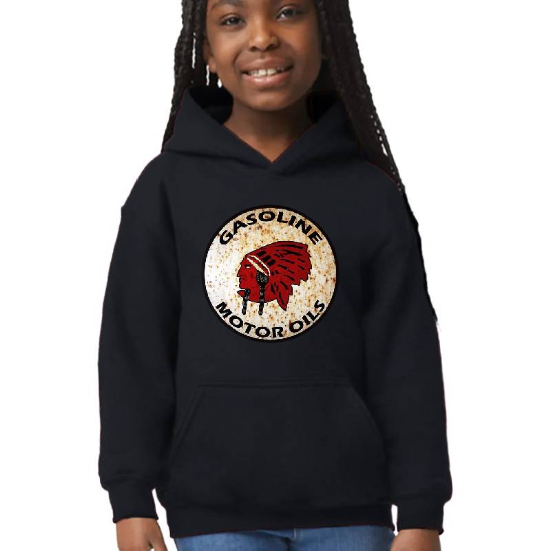 Red Indian Gasoline vintage sign reproduction rusted vers. design artwork printed on Youth Hooded Sweatshirt with latest DTF technology. Our new management team will place serving you. We offer best online shopping experience to our customers with 30 days return and exchange policy. Shop with confidence at T-funny.com