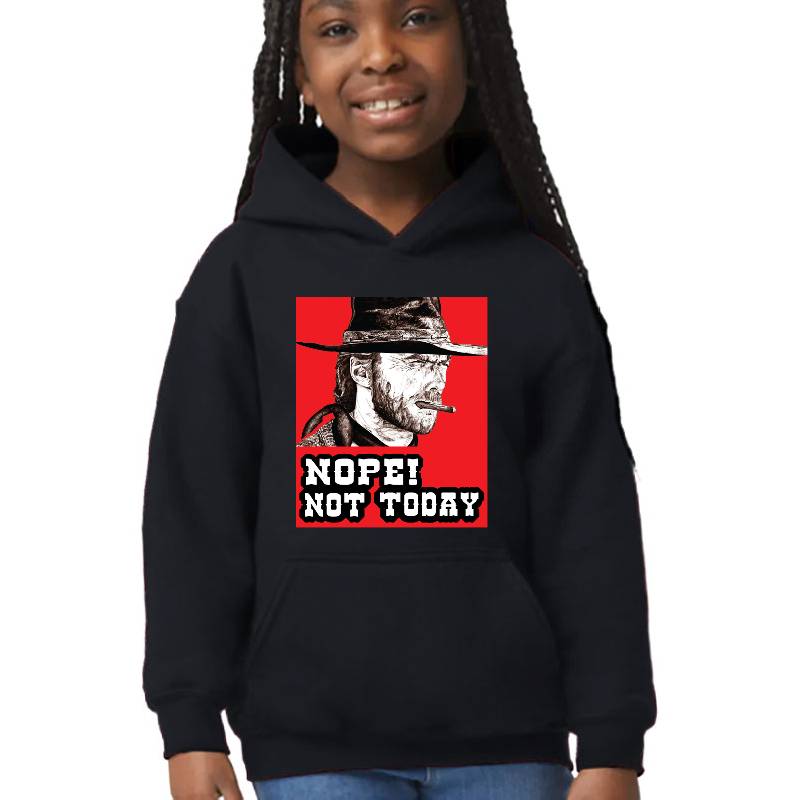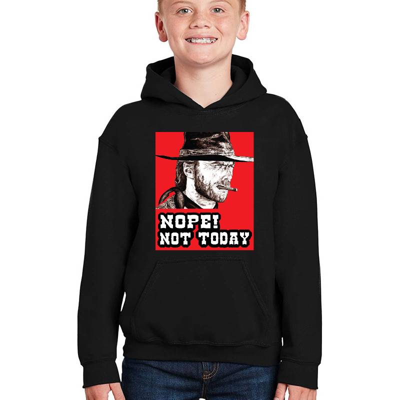 Nope Not Today Clint Eastwood Illustration design artwork printed on Youth Hooded Sweatshirt with latest DTF technology. Our new management team will place serving you. We offer best online shopping experience to our customers with 30 days return and exchange policy. Shop with confidence at T-funny.com