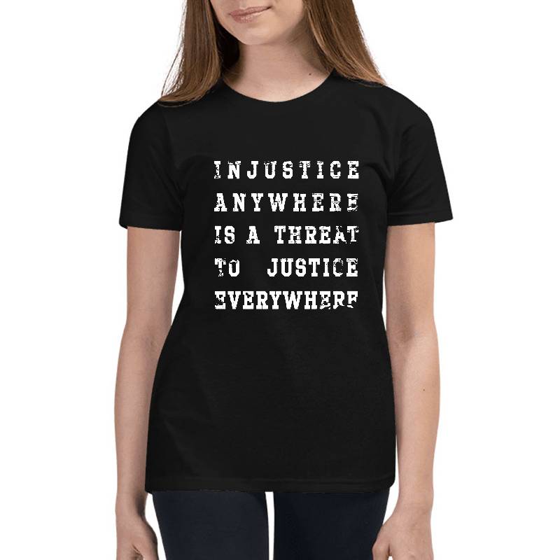 Injustice Anywhere Is A Threat To Justice Everywhere design artwork printed on Youth T-Shirt with latest DTF technology. Our new management team will place serving you. We offer best online shopping experience to our customers with 30 days return and exchange policy. Shop with confidence at T-funny.com