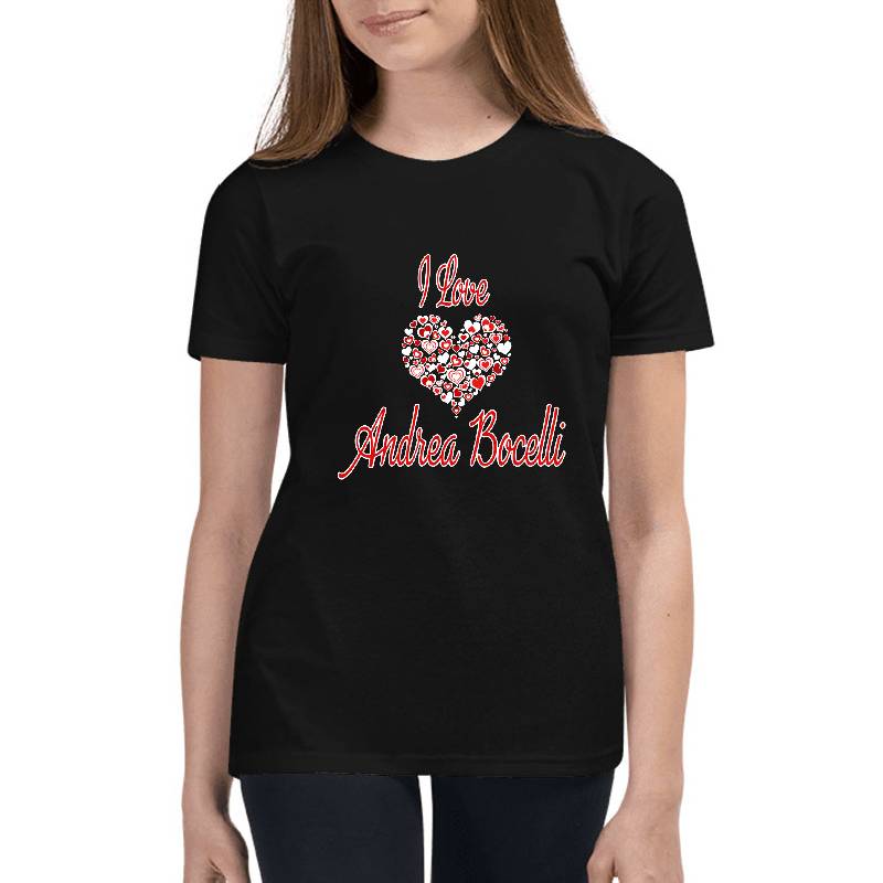 I Love Andrea Bocelli design artwork printed on Youth T-Shirt with latest DTF technology. Our new management team will place serving you. We offer best online shopping experience to our customers with 30 days return and exchange policy. Shop with confidence at T-funny.com
