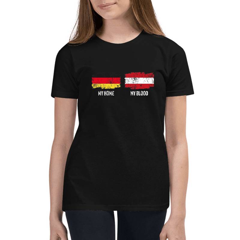 Home Germany blood Austria flag design artwork printed on Youth T-Shirt with latest DTF technology. Our new management team will place serving you. We offer best online shopping experience to our customers with 30 days return and exchange policy. Shop with confidence at T-funny.com
