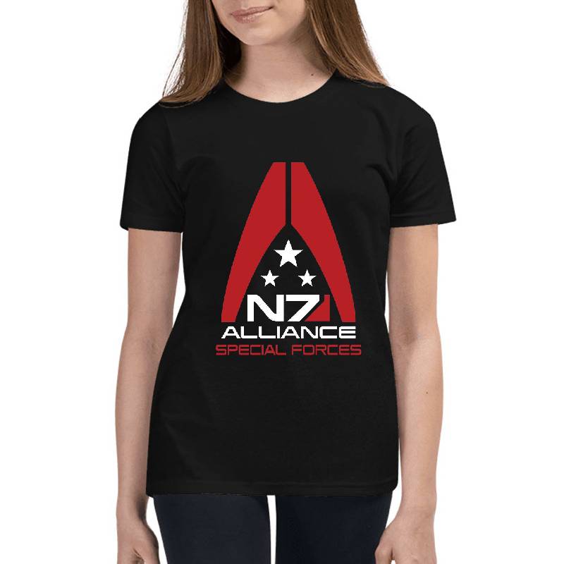 Mass Effect N7 Logo design artwork printed on Youth T-Shirt with latest DTF technology. Our new management team will place serving you. We offer best online shopping experience to our customers with 30 days return and exchange policy. Shop with confidence at T-funny.com