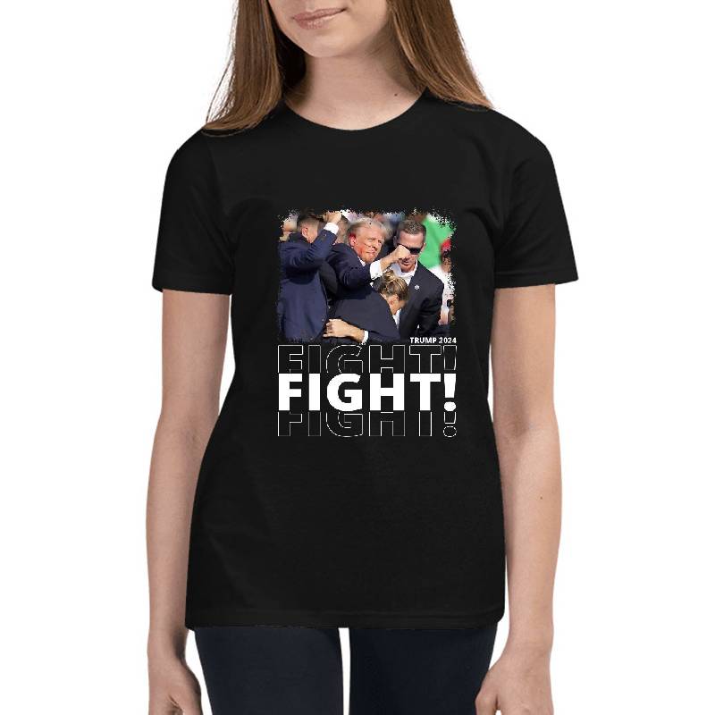 Trump Fight Fight Fight design artwork printed on Youth T-Shirt with latest DTF technology. Our new management team will place serving you. We offer best online shopping experience to our customers with 30 days return and exchange policy. Shop with confidence at T-funny.com