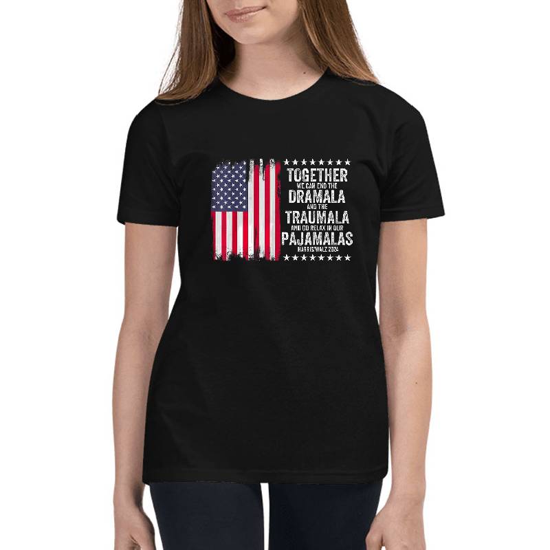 Kamala Harris Walz 2024 We Can End Dramala Traumala design artwork printed on Youth T-Shirt with latest DTF technology. Our new management team will place serving you. We offer best online shopping experience to our customers with 30 days return and exchange policy. Shop with confidence at T-funny.com