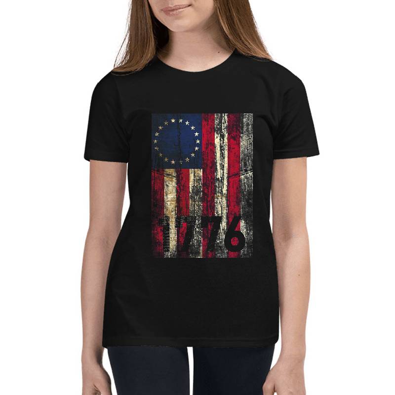 Betsy Ross Flag Vintage America First 1776 Betsy Ross Flag design artwork printed on Youth T-Shirt with latest DTF technology. Our new management team will place serving you. We offer best online shopping experience to our customers with 30 days return and exchange policy. Shop with confidence at T-funny.com