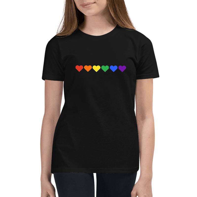 LGBT Rainbow flag hearts Equality Gay pride design artwork printed on Youth T-Shirt with latest DTF technology. Our new management team will place serving you. We offer best online shopping experience to our customers with 30 days return and exchange policy. Shop with confidence at T-funny.com