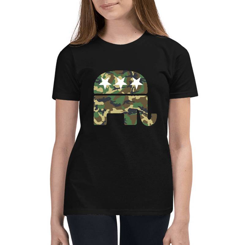 Camouflage Republican Elephant design artwork printed on Youth T-Shirt with latest DTF technology. Our new management team will place serving you. We offer best online shopping experience to our customers with 30 days return and exchange policy. Shop with confidence at T-funny.com