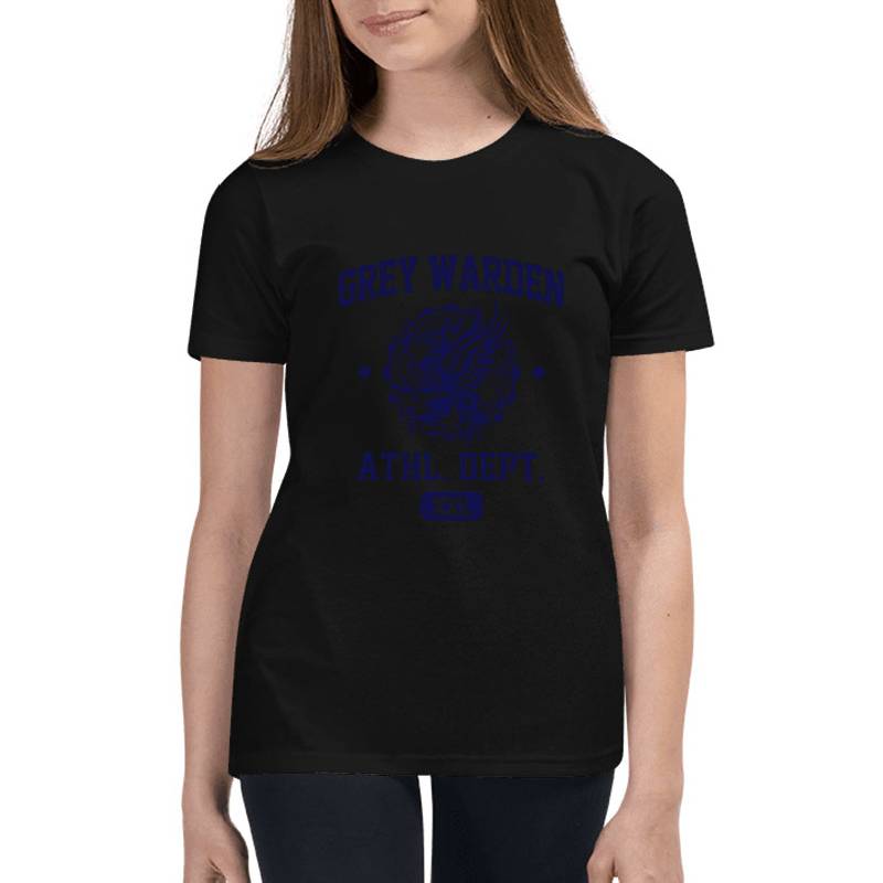 Grey Warden Athletic Department | Dragon Age Gym Shirt Style | Navy Print design artwork printed on Youth T-Shirt with latest DTF technology. Our new management team will place serving you. We offer best online shopping experience to our customers with 30 days return and exchange policy. Shop with confidence at T-funny.com
